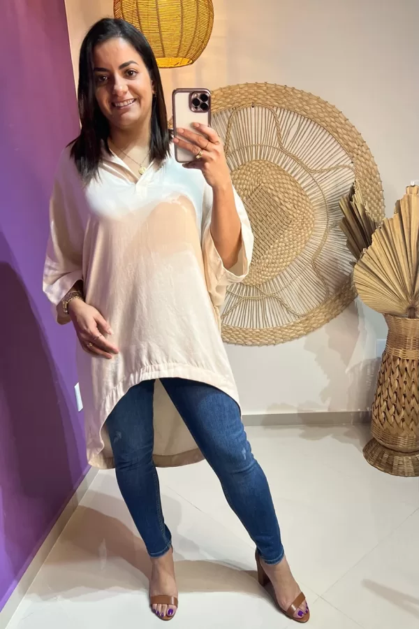 Confeccionada em 96% viscose e 4% elastano, a Bata Mullet Renata proporciona um toque suave e confortável. Seu decote em V, as mangas ¾ e a modelagem soltinha garantem um caimento fluido e elegante, ideal para compor looks versáteis e estilosos.