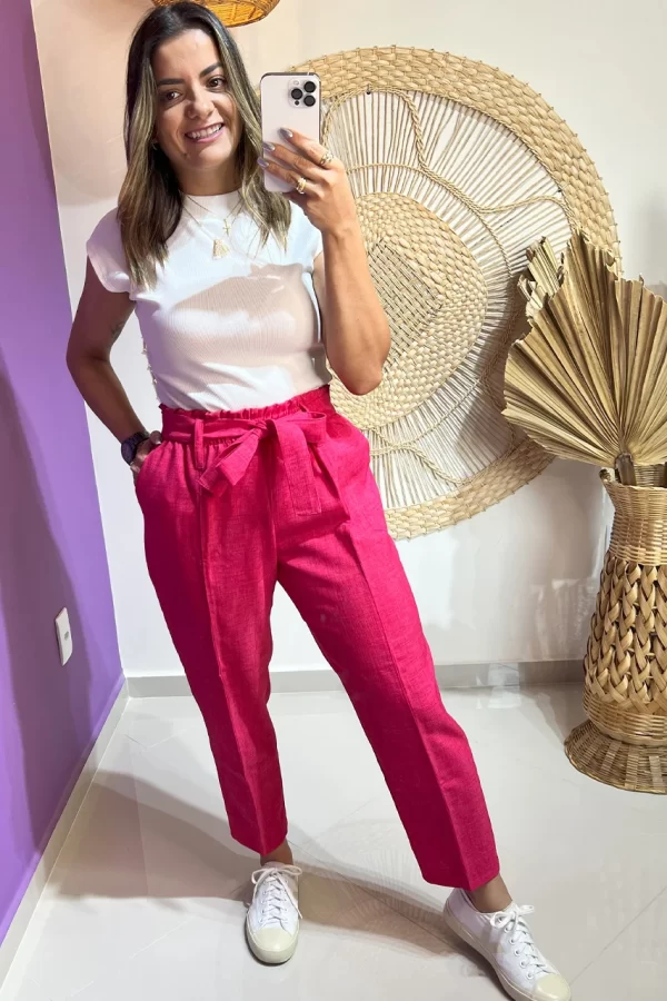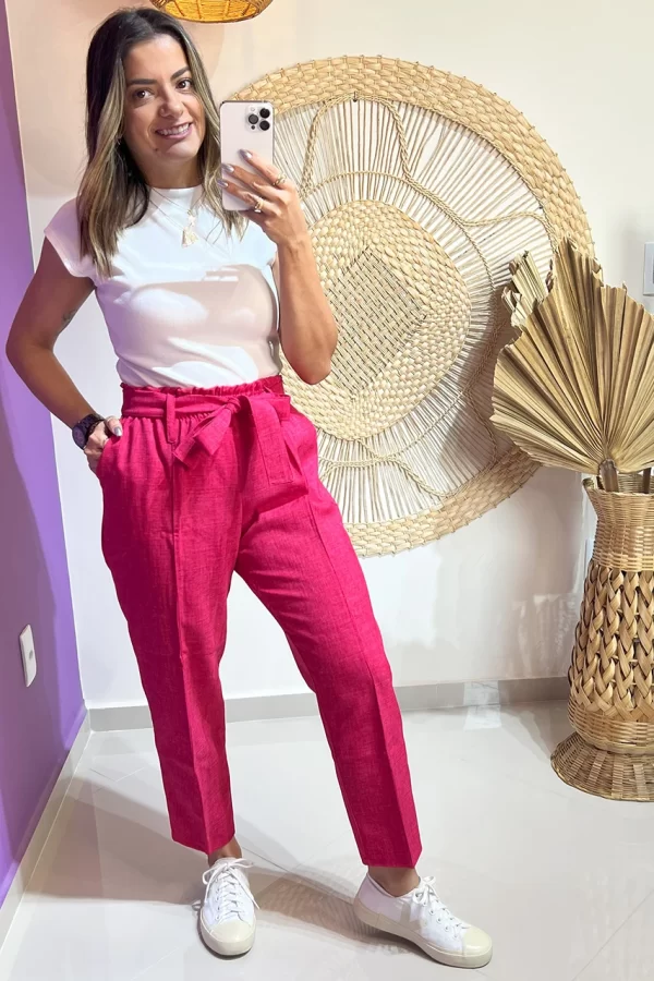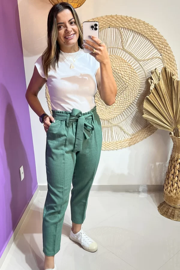 Detalhes: elástico na cintura para um ajuste perfeito, bolsos laterais funcionais e faixa de amarração que adiciona um toque sofisticado ao look.