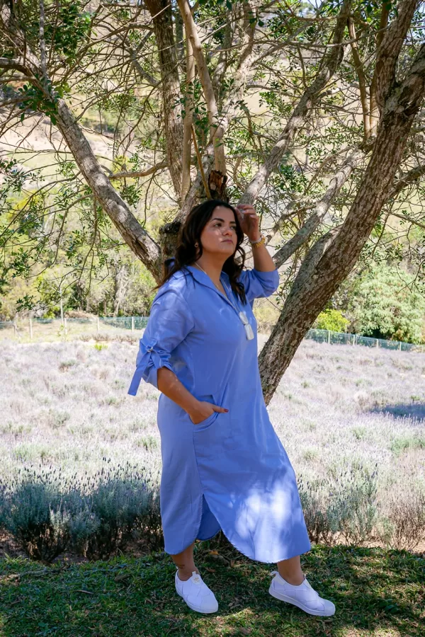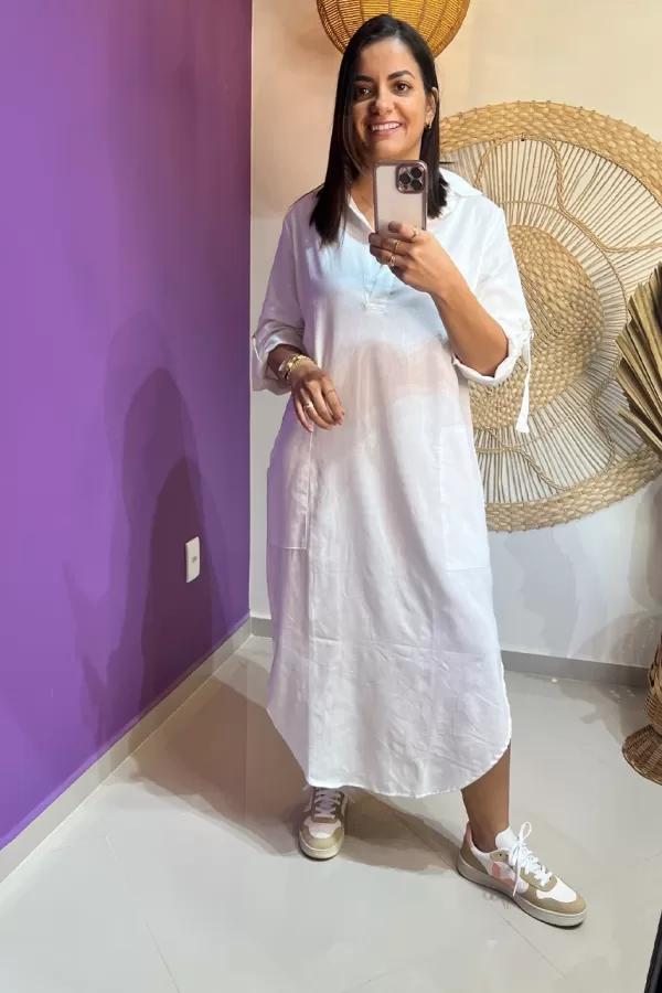 Confeccionada em 70% viscose e 30% linho, a Chemise Vera é a escolha perfeita para quem busca elegância com conforto. Seu design conta com bolsos laterais, garantindo praticidade, e mangas com detalhes de amarração, que adicionam um toque moderno e refinado.