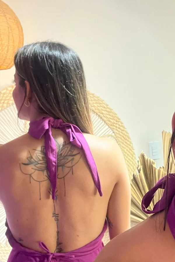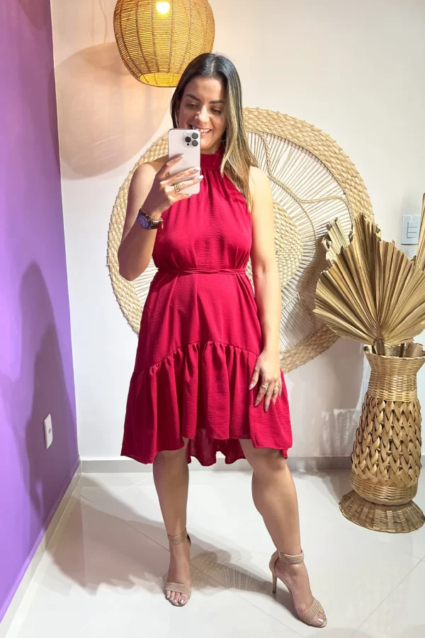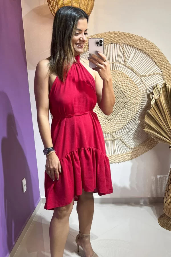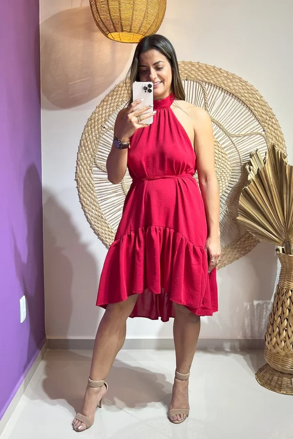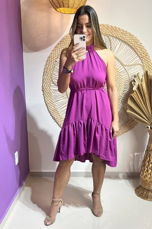 Detalhes: frente única que valoriza os ombros, faixa de amarração na cintura para ajuste perfeito e acabamento refinado na barra, adicionando charme à peça.